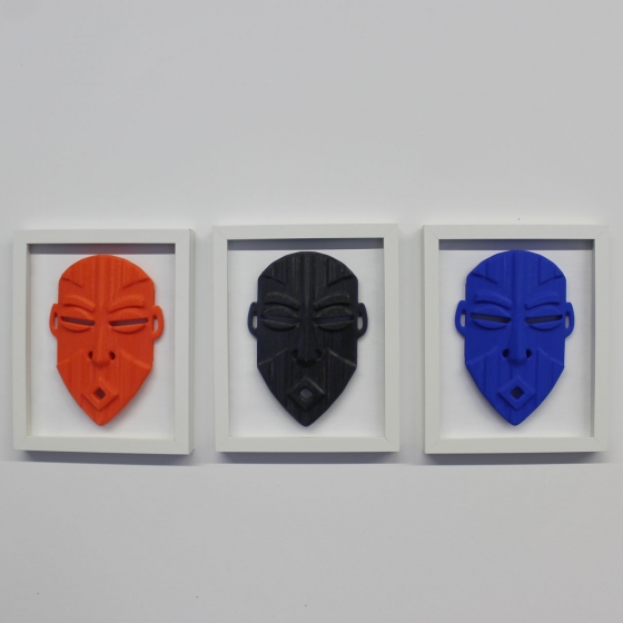 Egun is a mask that pays tribute to departed ancestors, who sacrificed to pave the way for their generation and beyond. Enclosed in an all-white wooden frame, the mask is a custom 3D print made from PLA filament (500g); a biodegradable plastic that is safe for the environment because it can be made from renewable resources such as corn starch.  *PLA is short for Polylactic Acid*